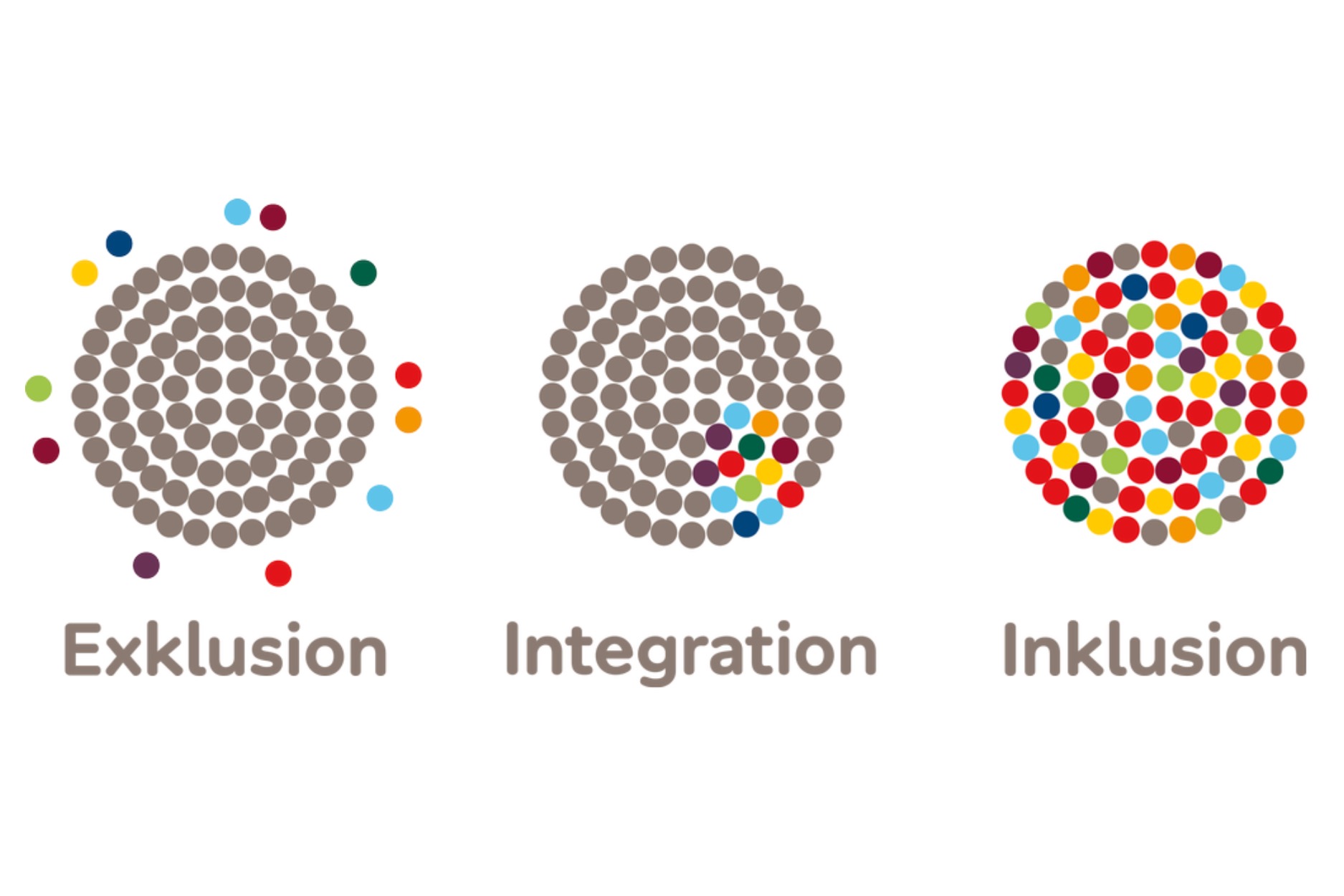 Nach Jahrhunderten der Exklusion (Ausgrenzung) war in Deutschland lange die Integration von Behinderten das Ziel. Sie sollten als Teil der Gesellschaft gute Entwicklungschancen und Bildungsmöglichkeiten erhalten. Die heutige Inklusion geht darüber hinaus, wie das Schaubild von Aktion Mensch eindrücklich aufzeigt.