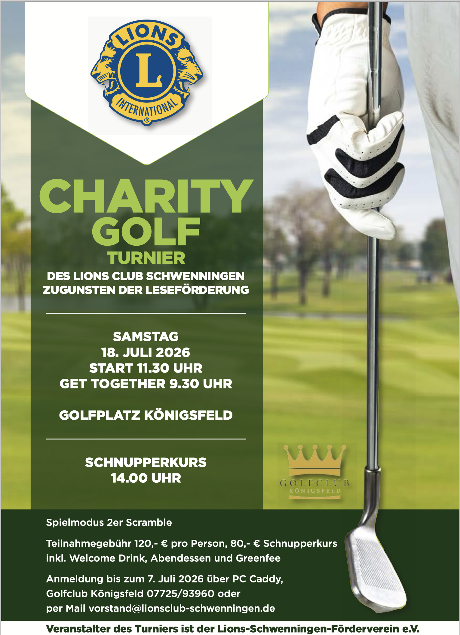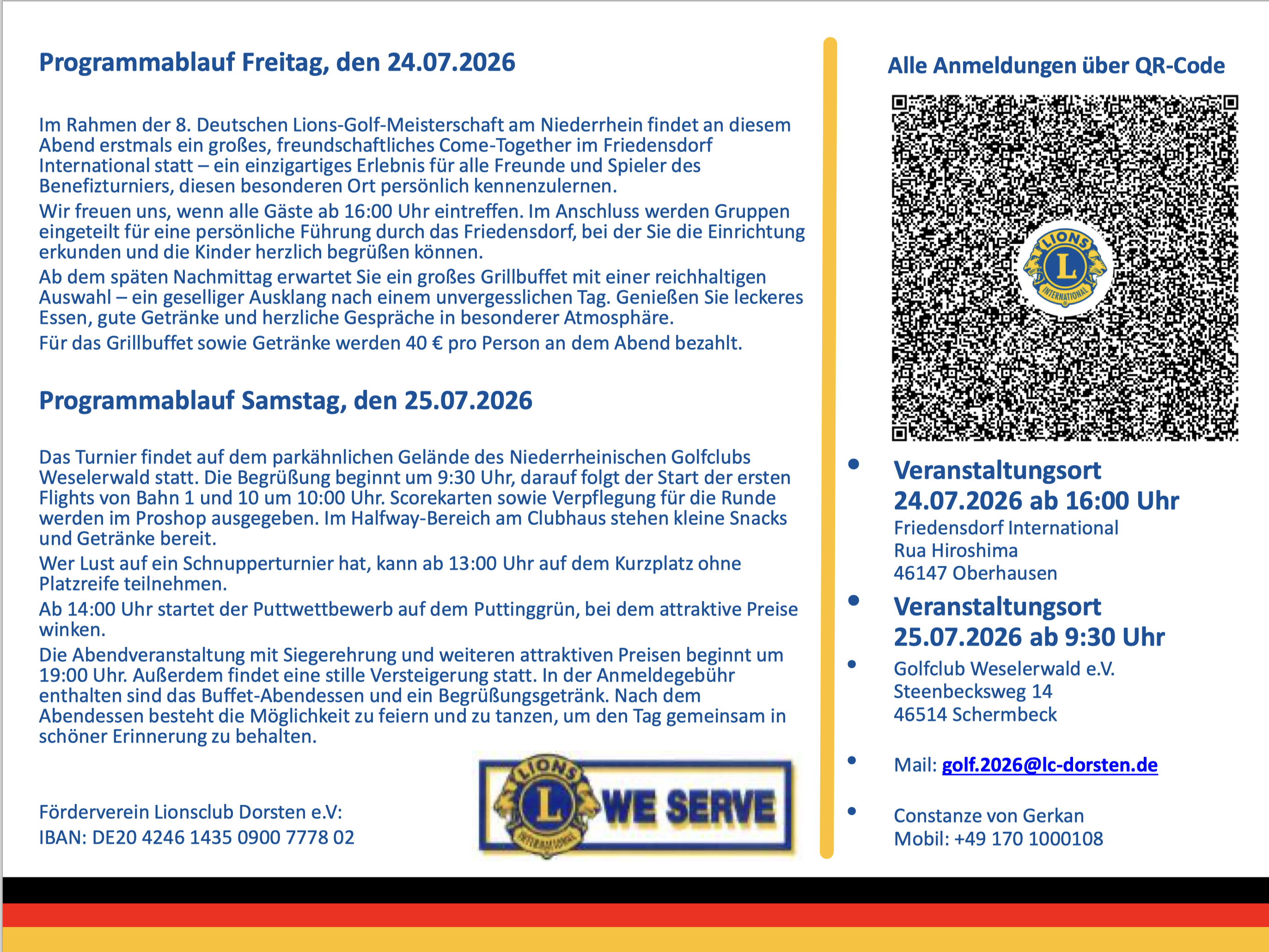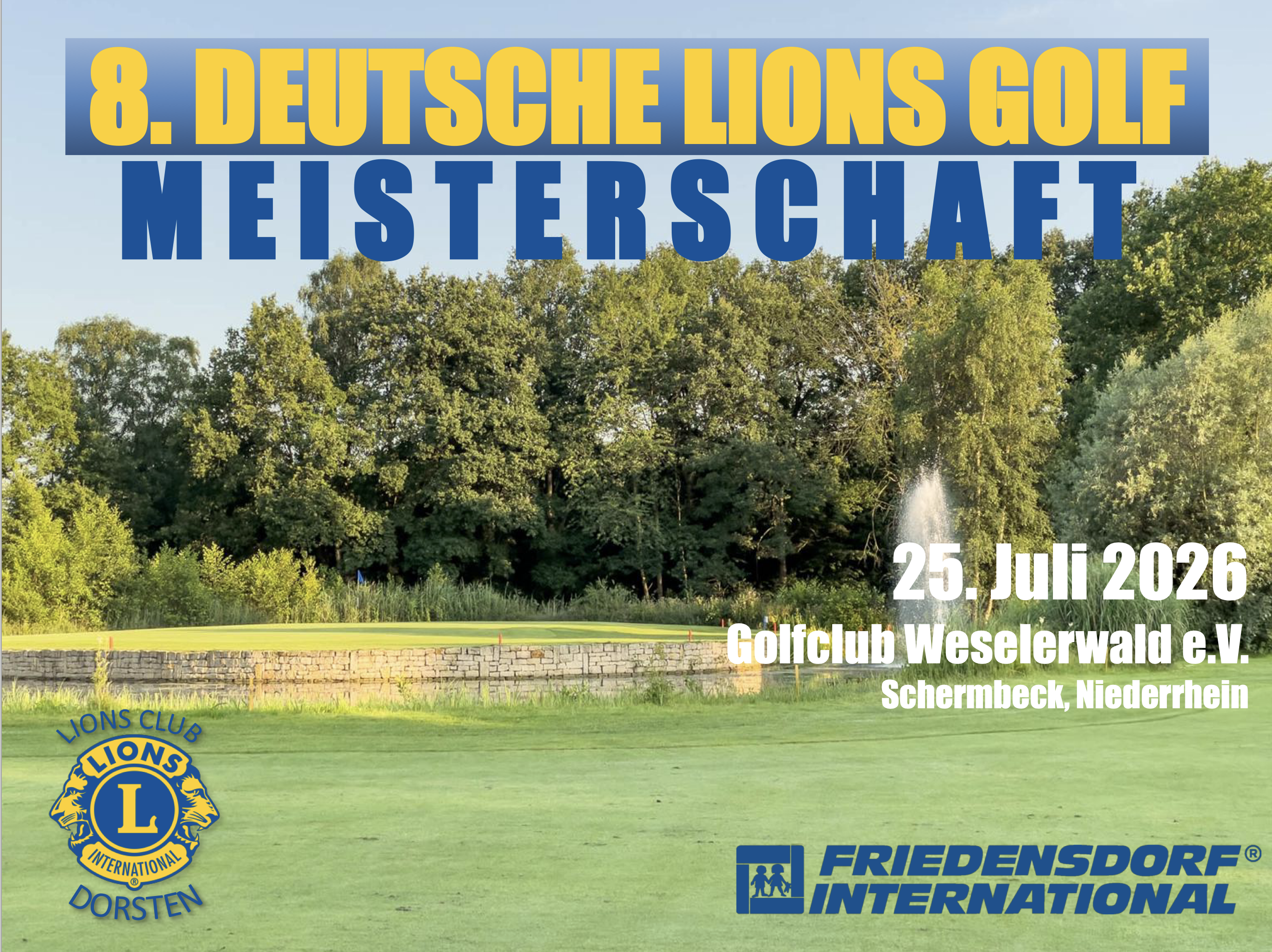 Gemäß unserem Vorsatz „We Serve“ möchten wir dieses Golfturnier dazu nutzen, viele Lions Freunde aus ganz Deutschland zusammenzubringen und gleichzeitig einen Beitrag für das Friedensdorf International in Oberhausen zu leisten, welches quasi vor der Tür liegt. Gespielt wird ein vorgabewirksames Wettspiel am schönen Niederrhein auf dem Golfplatz Weselerwald.