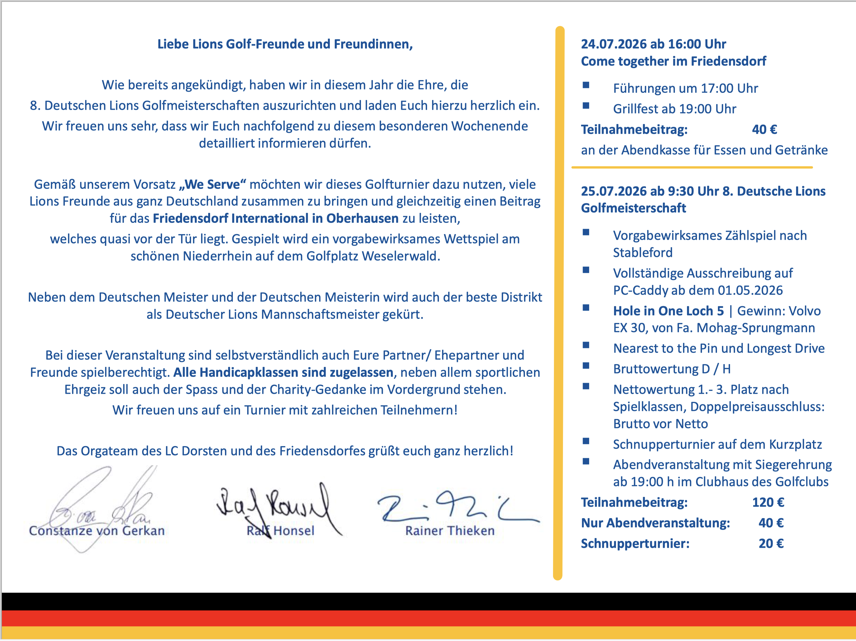 Wie bereits angekündigt, haben wir in diesem Jahr die Ehre, die 8. Deutschen Lions Golfmeisterschaften auszurichten und laden Euch hierzu herzlich ein. Wir freuen uns sehr, dass wir Euch nachfolgend zu diesem besonderen Wochenende detailliert informieren dürfen.